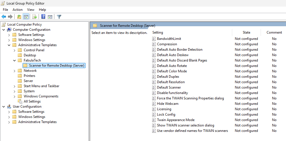 | TwainDefaultProfile | REG_SZ | Default, Last Settings, %user defined% | Not exists | "Default" | Currently used config (profile file) of TWAIN scanner (like resolution, paper size, etc.). It contains the name of the profile displayed in the TWAIN scanning UI. If "Default" or not exists - reset scanner to the default configuration. "Last Settings" - last used settings applied. Profile files are stored at the following location: CSIDL_APPDATA/FabulaTech/Scanner for Remote Desktop/Profiles/%%profile_name%%.DSP |