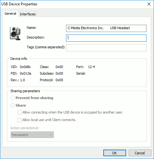 If this device is a composite device, the Interfaces tab will be displayed in the window. You can see what interfaces of the composite device are shared.
