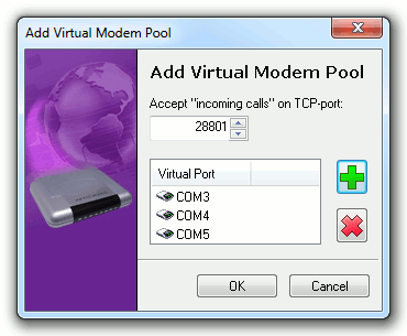 As a result, the program creates several virtual modems listening on specified TCP port.